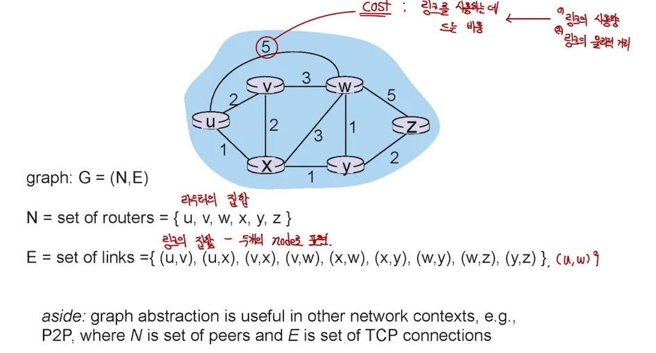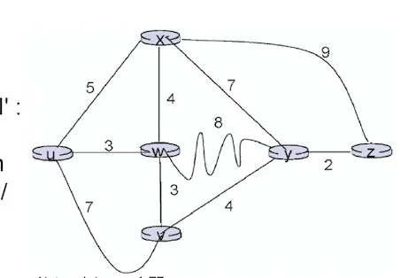 위 네트워크에서 출발지 u 에 대해 least cost path 를 모두 구하시오