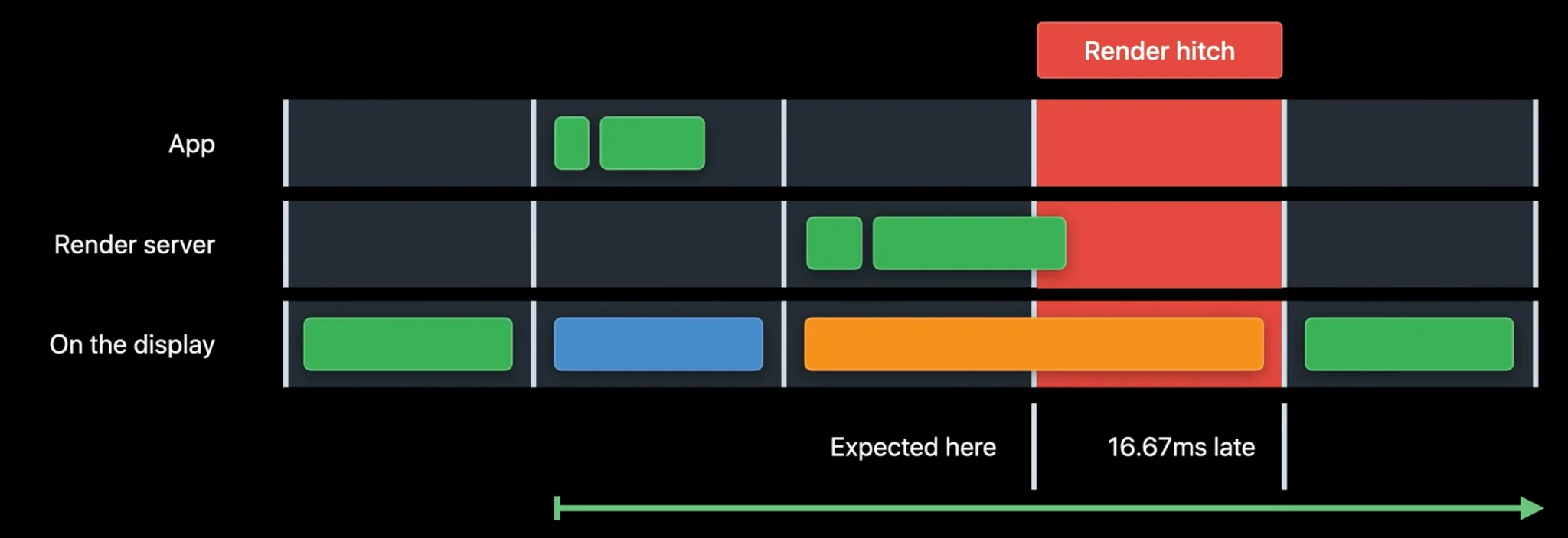 VSYNC 시기에 적절하게 다음 단계로 넘어가지 못하면 그 다음 VSYNC 때 다음 단계로 진입할 수 있으므로 프레임이 한프레임 밀리게 되고 사용자는 화면이 버벅인다고 느낍니다. 이를 hitch 라고 표현하더라고요 :)