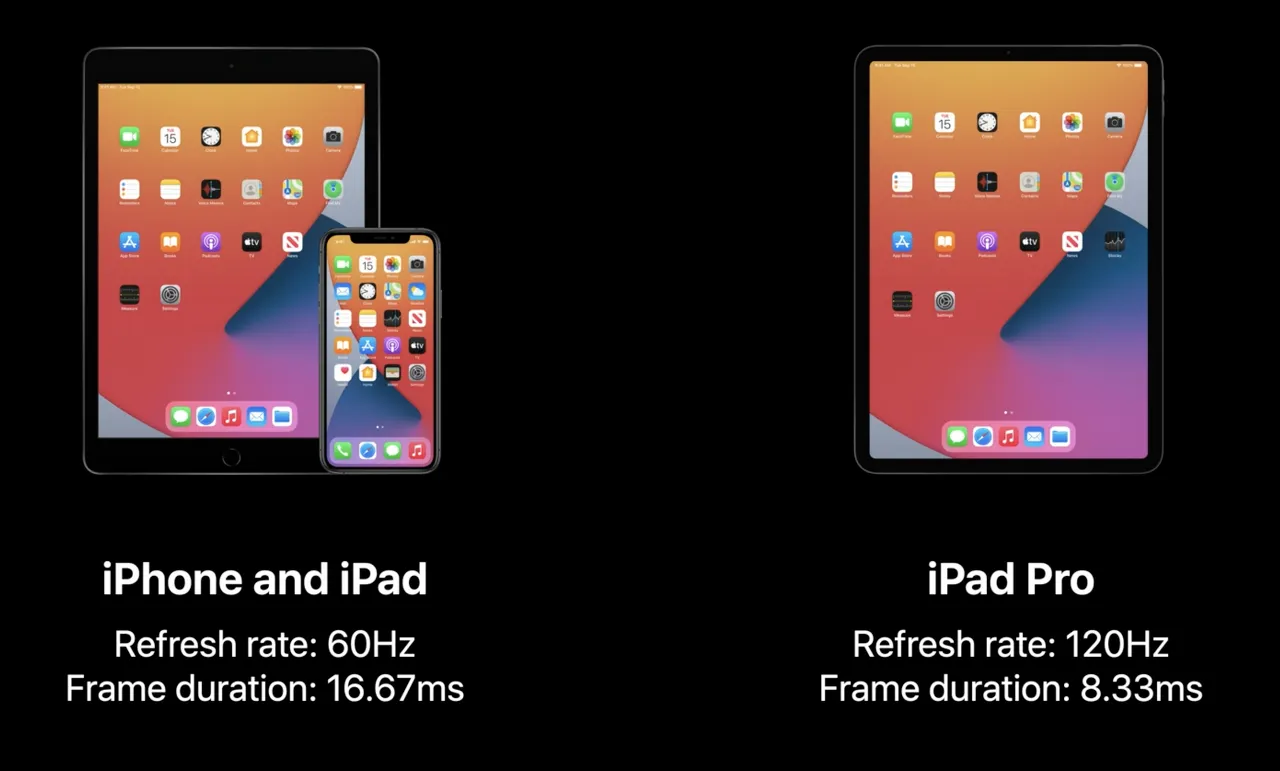 아이폰과 아이패드는 60Hz , 아이패드 프로는 120Hz 의 주사율을 갖고 있어요. 즉 아이폰 은 1초에 60 번 화면을 업데이트하고 아이패드 프로는 120번 업데이트 합니다.
