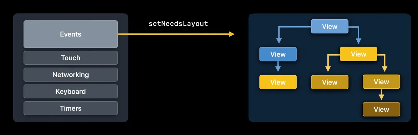 setNeedsLayout 은 모든 레이어를 확인해보며, 레이어가 재연산이 필요한지 점검합니다. (여기서 재연산이 필요한 레이어는 변경이 요구 되는 레이어 입니다)