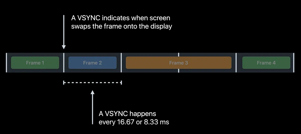 VSYNC 마다 화면을 전환해서 보여주게 되는데, 이때까지 앞서 본 작업이 마무리가 되지 않으면, 한프레임 뒤로 밀려서 다음 VSYNC 때 뷰의 변경사항이 보여지게됩니다.
