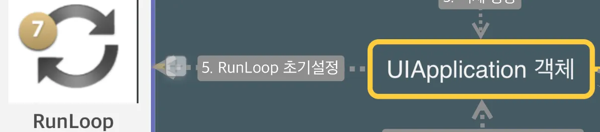 UIApplication 객체가 Run Loop 를 포함한 이벤트처리 루프를 설정하고 이벤트 처리를 시작합니다.