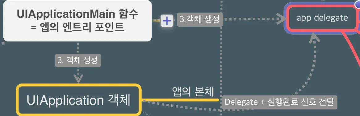 호출된 UIApplicationMain 함수는 UIApplication 객체와 appdelegate 클래스의 객체를 생성합니다.