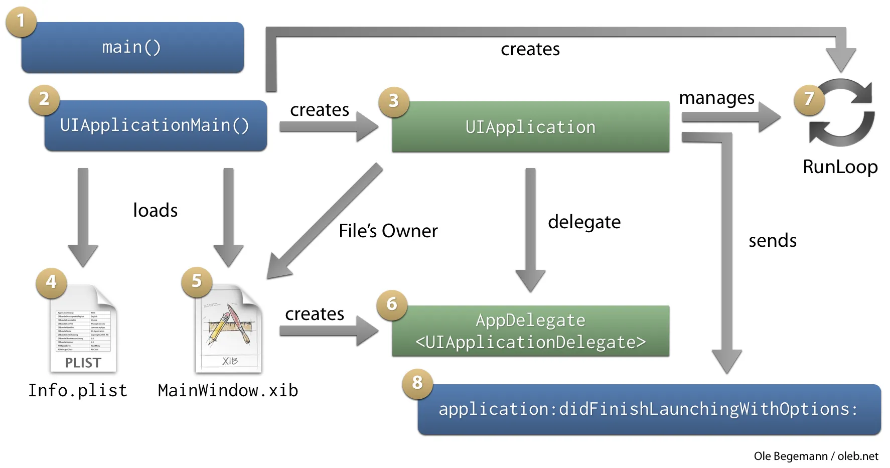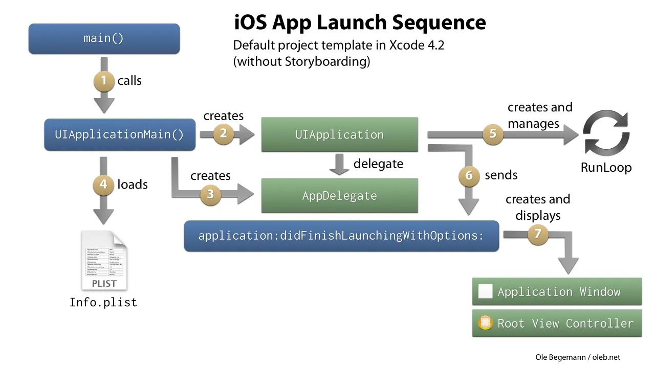 main() 함수가 UIApplicationMain 함수 호출, 호출된 합수는 UIApplication 객체를 생성하고, app delegate 객체를 생성합니다.