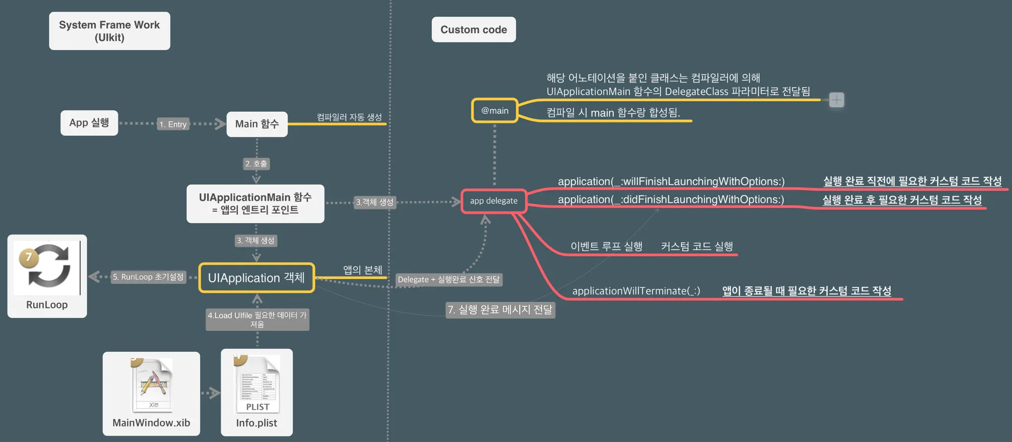 UIApplicationMain()함수는 iOS앱 부분의 엔트리 포인트가 된다. 객체를 생성하는 프로세스 핸들링, 개발자가 작성한 커스텀 코드를 호출, 앱 생성 초기설정을 구현한다.