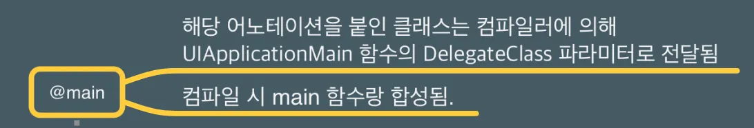 이떄 @main 어노테이션이 붙은 appdelegate 클래스가 main 함수와 합성되게 됩니다.