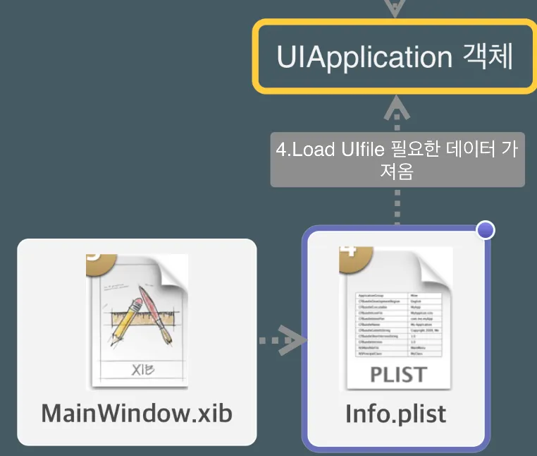 이때 nib 파일이 Info.plist 에 등록되어 있으면 UIApplication 객체는 해당 nib 파일 또한 불러옵니다. (UI 구성에 필요)