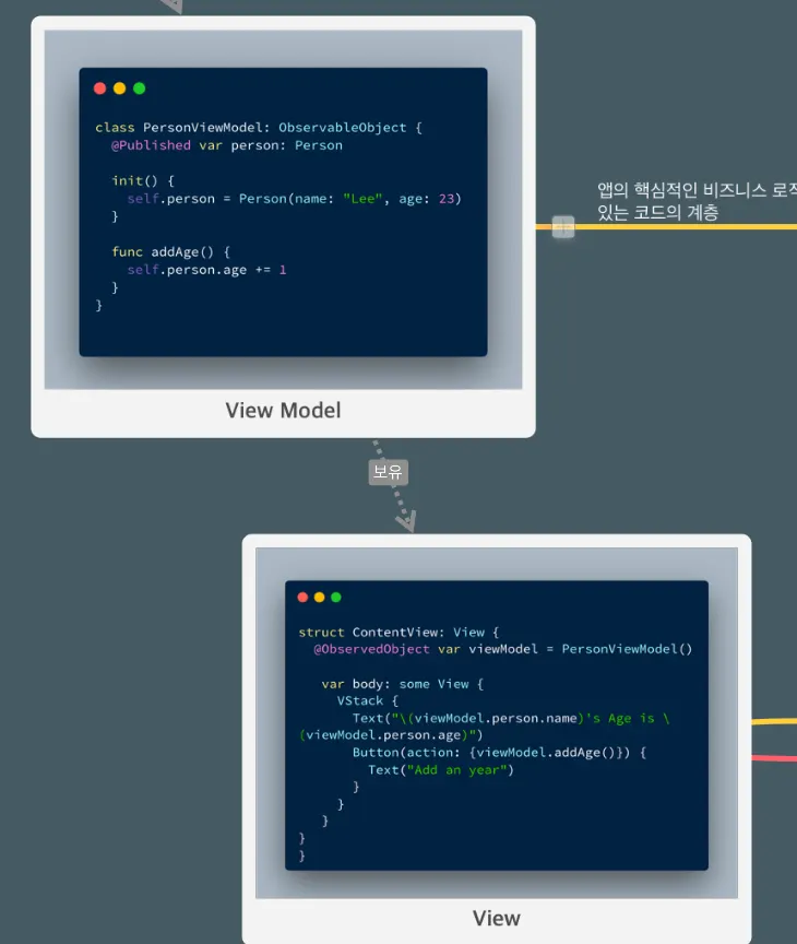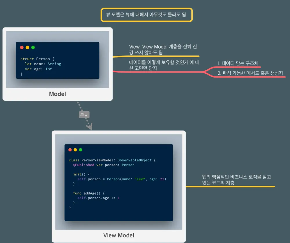 Model 을 소유하고 있는 로직들의 모음 UI관련코드와는 완벽하게 분리.