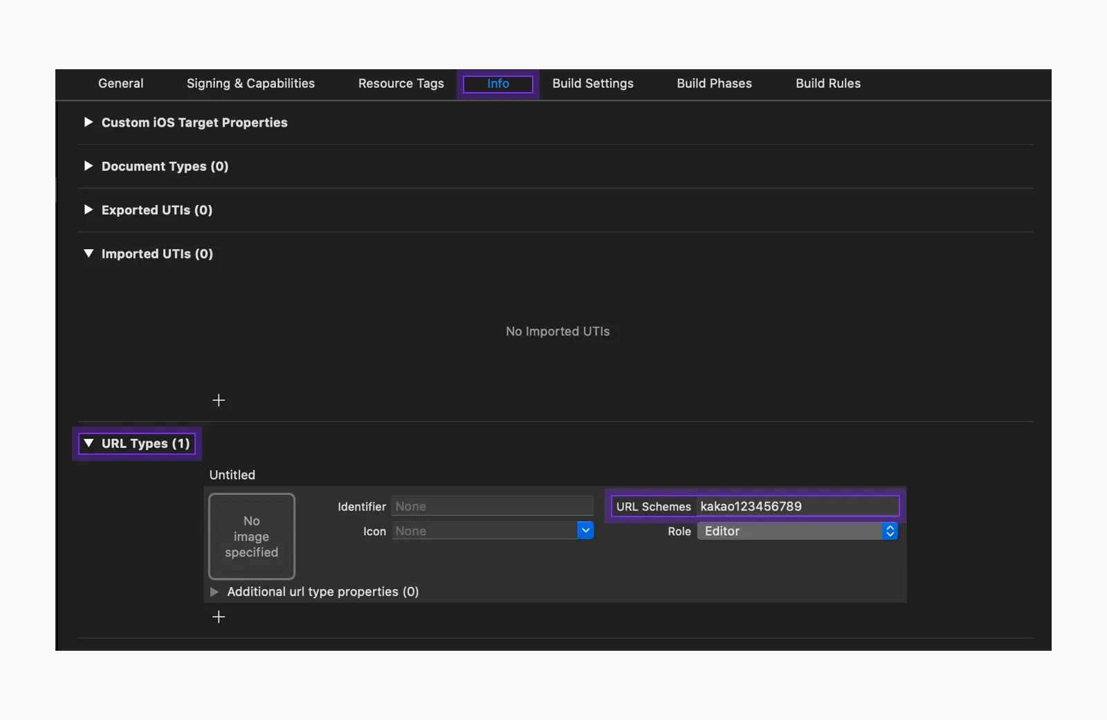 카카오계정을 통한 인증과 카카오톡 메시지를 통한 앱 실행을 위해 URL Schemes 설정을 합니다. [Info] > [URL Types] > [URL Schemes] 항목에 네이티브 앱 키(Native App Key)를 'kakao{NATIVE_APP_KEY}' 형식으로 등록합니다. 예를 들어 네이티브 앱 키가 '123456789'라면 'URL Schemes'에 'kakao123456789'를 입력합니다.