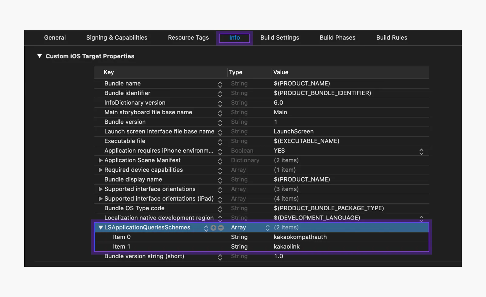[Info] > [Custom iOS Target Properties]에 Array 타입 키(Key)인 LSApplicationQueriesSchemes를 추가하고, 해당 키의 'Item'으로 커스텀 URL 스킴에 사용할 값인 'kakaokompassauth', 'kakaolink'를 추가합니다.