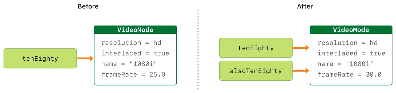 tenEighty 와 alsoTenEighty 둘다 상수로 선언된 것을 볼 수 있습니다. 그러나 여전히 둘의 프로퍼티를 변경할 수 잇습니다. 이는 tenEighty 와 alsoTenEighty 의 값 자체가 실제로 변하는 것이 아니기 때문입니다. tenEighty 와 alsoTenEighty 은 VideoMode 의 객체를 '저장' 하지 않고 '참조'합니다. 참조 대상을 변하지 않는 이상 상수로 사용이 가능합니다.