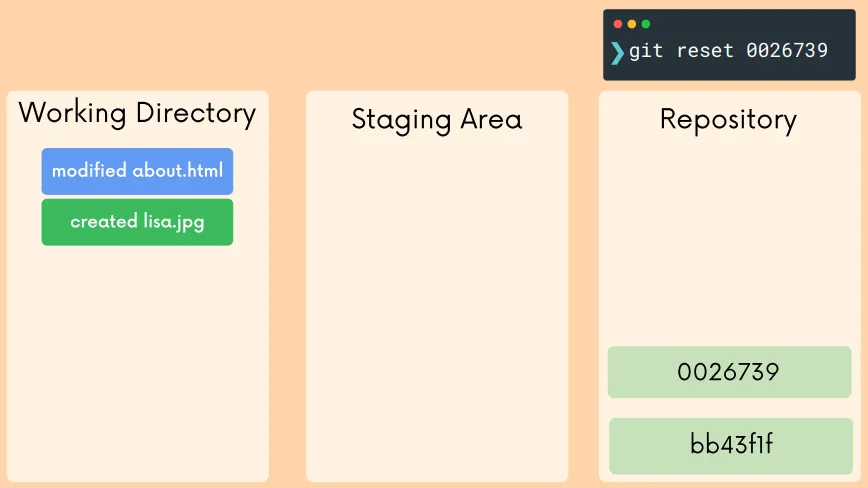 특정 커밋으로 되돌아가고, 해당 커밋 이후의 커밋은 삭제함.