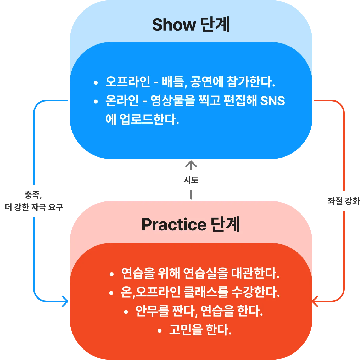 그리고 Show 단계에서의 좌절과 자극은 Practice 단계를 강화하게된다.