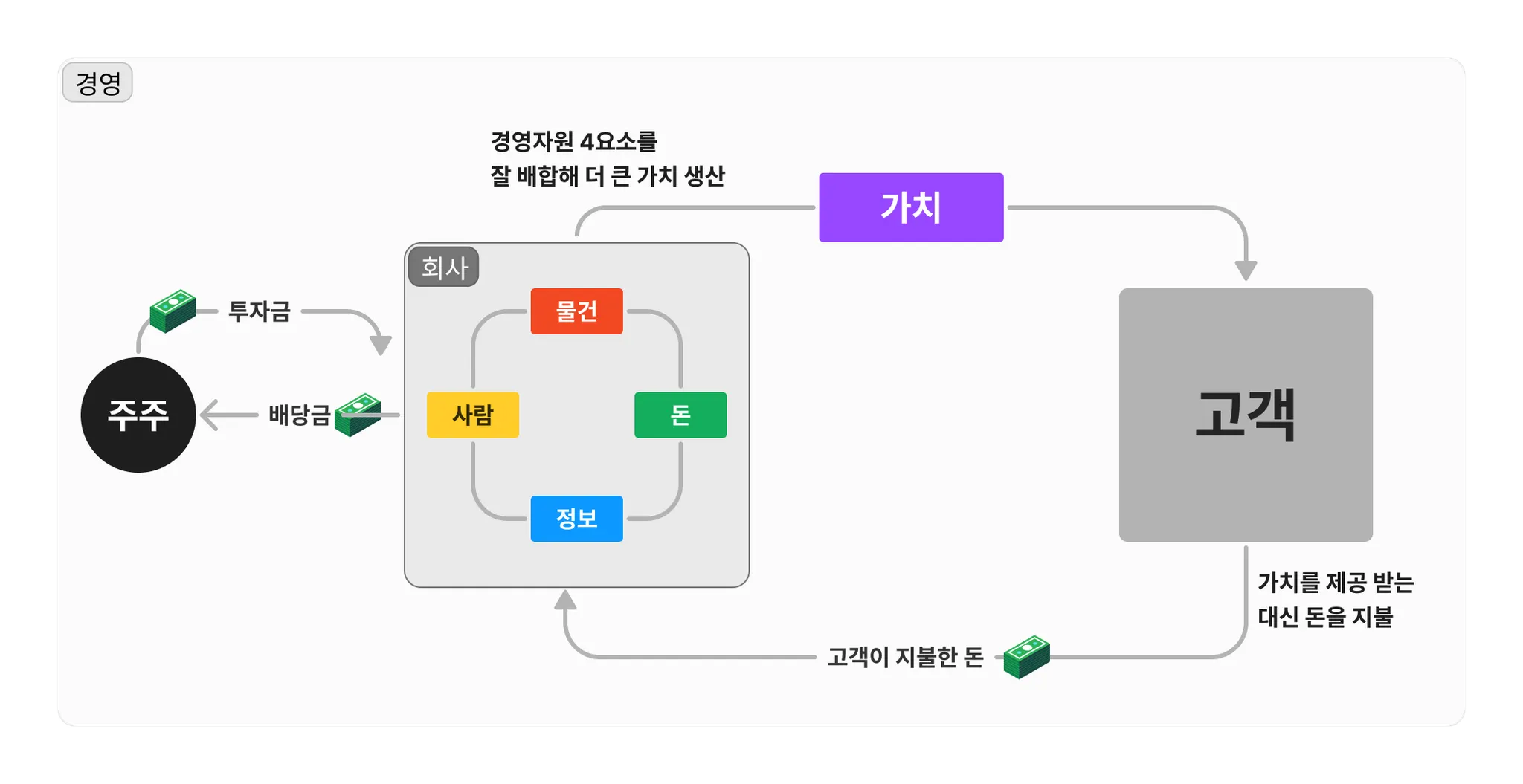 회사는 투자금을 받아, 물건, 사람, 정보 돈등의 4요소를 잘 배합해 더 큰 가치를 생산하고 이를 고객에게 제공한다. 고객은 가치를 제공 받는 대신 돈을 지불하게 되고, 이렇게 환수한 금액의 일부는 주주에게 배당금으로 지급된다.