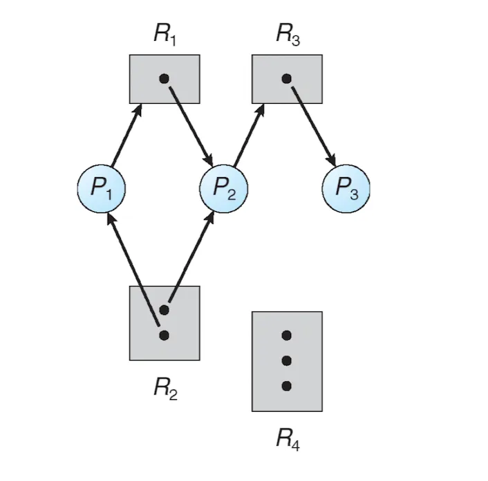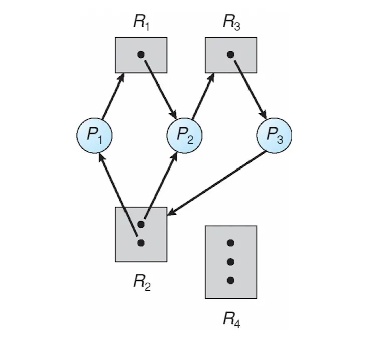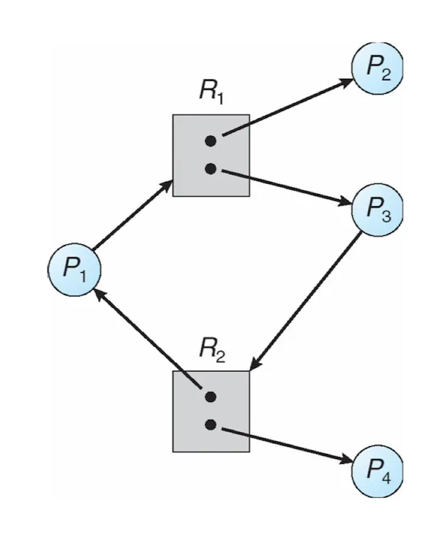 다음 Resource allocation graph 를 보고 데드락인지를 판별하시오