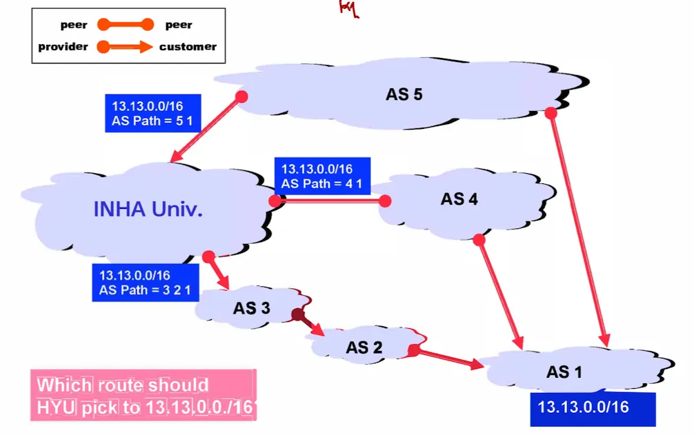 인하대에서 AS1 으로 데이터를 보내야 한다고 가정하자. 경제학적 관점에서 인하대는 어떤 링크를 통해 데이터를 내보내야할까?