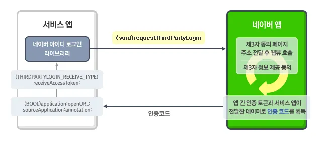 사용자가 애플리케이션에서 네이버 로그인할 때 애플리케이션은 네이버 앱에 OAuth 2.0 인증을 요청합니다. 네이버 앱은 간편 로그인 프로세스를 거쳐 인증 코드를 획득하고, 획득한 인증 코드를 애플리케이션의 URL Scheme을 통해 애플리케이션에 반환합니다.