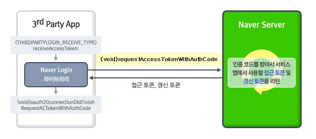 인증 코드 획득에 성공하면 네이버 서버에서 접근 토큰과 갱신 토큰(refresh token)을 받아옵니다. 서버 호출 결과로 값을 받으면 델리게이트를 호출하고 호출 성공 여부를 판단합니다. 호출에 성공하면 접근 토큰으로 오픈 API를 호출할 수 있습니다.