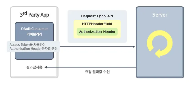 오픈 API를 호출할 때 애플리케이션에서는 접근 토큰을 사용해 인증 헤더(authorization header) 문자열을 구성해야 합니다. 이렇게 구성된 문자열은 오픈 API 호출 시 HTTP Header 필드에 추가해 서버로 함께 전송합니다.