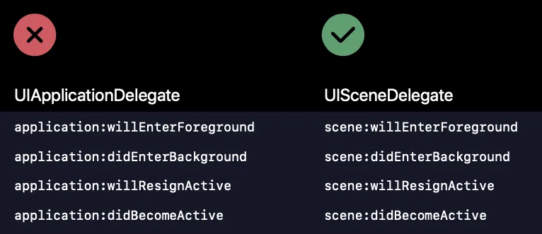 AppDelegate 의 UI Lifecycle 핸들링 역할은 SceneDelegate 에게 넘겨주었음.