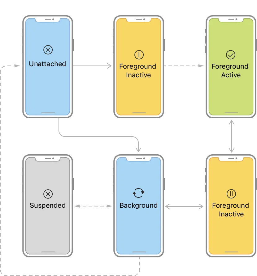 iOS 12 까지는 하나의 앱이 하나의 process와 하나의 user interface 객체와만 matching 되었었다. 이전처럼 하나의 process를 사용하긴 하지만 다수의 UI 객체나 scene session들을 가지게 되기 때문이다.